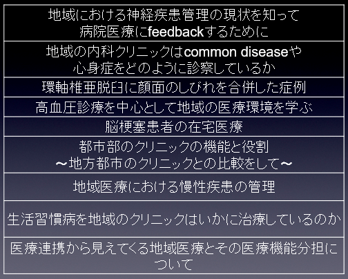 - 生活者としての地域住民の疾病構造の理解、その診療方法の違いがよく理解されました。