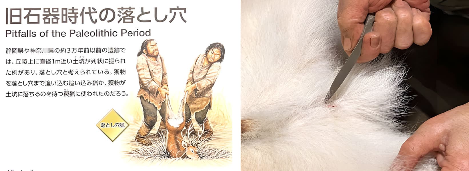 縄文時代にハイライトが当たっているために忘れがちな旧石器時代だが、彼らは鹿の角で作った縫い針を器用に扱って、衣服、靴や手袋を作り、黒曜石も利用していた。槍や弓矢での狩猟はもちろんのこと、落とし穴を作って効率的に獲物を獲る工夫もしていた。海外ではフランスのマルヌ県で約1万1千年前のものが見つかっているが、静岡県三島市川原ケ谷の落とし穴が3万年前と最古のものと見られている。狩り取られた獣の解体をする石刃(せきじん)は、石器ではあっても鉄の刃に劣らない鋭さがあった。