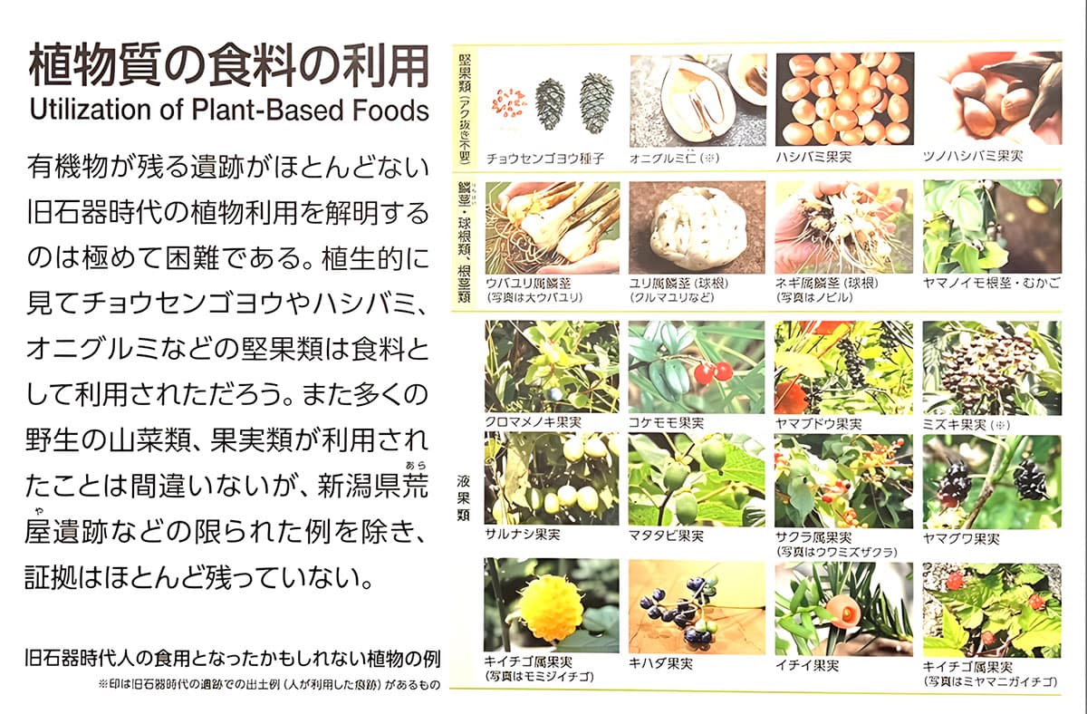 旧石器人(縄文人にも受け継がれた)がどんな食べ物をどのように調理して食べていたかは、有機物が遺跡に残されていないために確定するのは難しい。そのため当時の植生や一部の遺跡、新潟県荒谷遺跡などから得られた資料から想像する他はないが、かなり豊かな植物を利用していたことが考えられている。