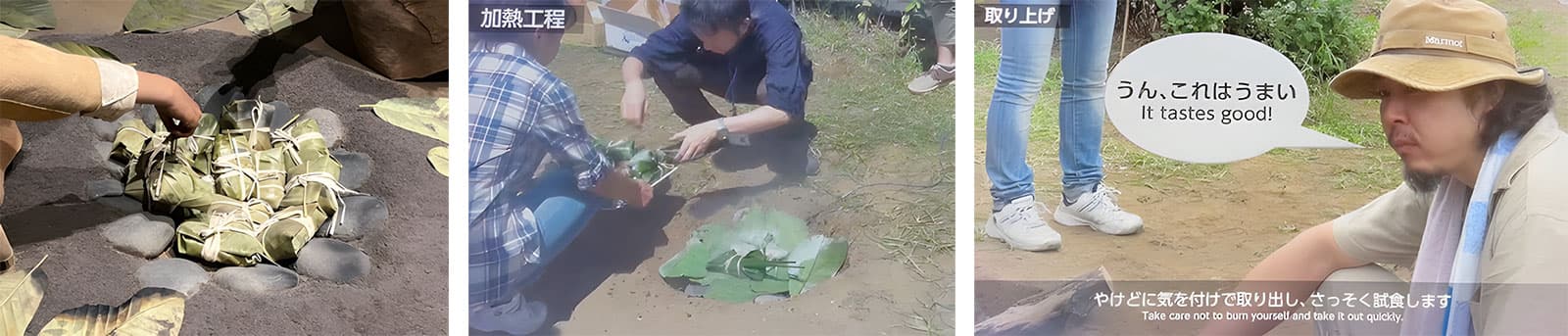 当時の調理法として、肉や魚、球根類などを葉で包み、熱した礫に並べて葉と土で覆い、数十分蒸し焼きにする「石蒸し調理」が行われていたことが考証されている。実際に国立歴史民俗博物館の館員たちがその調理を再現して食べるビデオが公開されていた。シカ肉や山菜、ユリ根などの食材を葉で包み、カラムシの紐でしばり、皿状の穴に熱した礫を入れ、葉と包んだ食材を置いて土をかぶせて約30分蒸して出来た料理は大変美味しい物だったという。写真左が旧石器時代の復元模型。右2枚が館員による調理再現実証実験。