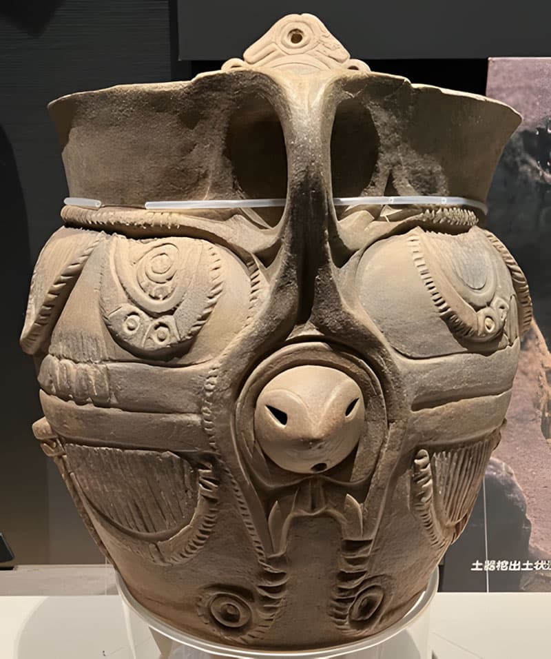 左の土器上の土器は国立歴史民俗博物館の展示物。母体を象った土器から赤子が頭を出しているもの。産道を通る時には目が膣壁に引っ張られて細くなっている。母親の外陰部は、小陰唇、肛門に至るまで丁寧に描かれているが、生々しさを消して、器としての絶妙なバランスを整え、全体をアーティスティックなフォルムに落とし込んである。