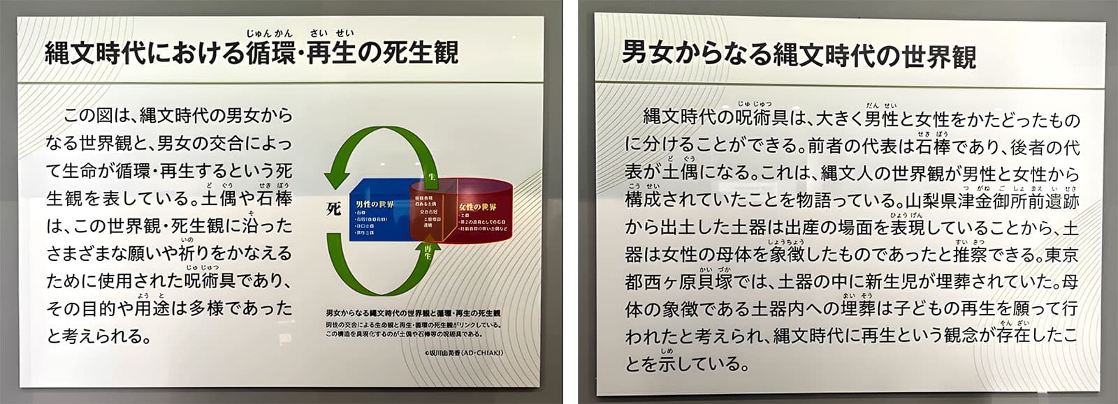 よく見ないとわからない線は、女性の長い髪の毛と乳房、腰蓑のようにも見えて、これが何らかの祈りを込めたお守りのようなものではなかったか、と考古学者は考えた。女性が子供を産むことが神秘的な事柄であり、まさに命を授かることが神業であることから、女性は神としてあるいはその使いとして命の再生のシンボルでもあったのだ。国立歴史民俗博物館には日本中から貴重な石偶・土偶が集められていて、今まで読んだ本や資料に出てきたものが目の前にあることに大変感激した。