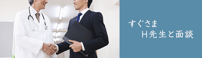 私はこの勢いのまま、法人の担当者へ連絡をいたしました。その担当者からはH先生が63歳とお若いとこや、内科的対応が可能な点に興味をお持ちいただき、すぐ面接へという流れになりました。